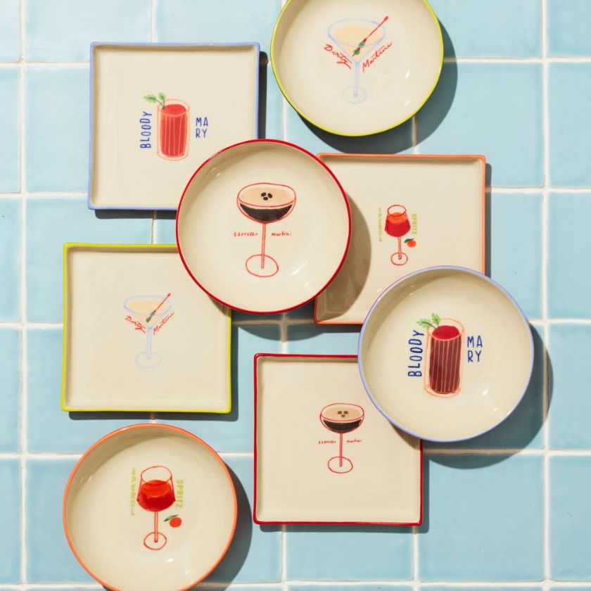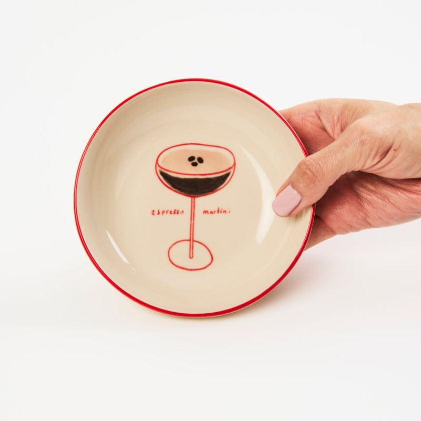 For olives, nuts or a strong hit of espresso martini energy. This espresso cocktail bowl features a hand-painted martini glass rimmed in rich chocolate tones, with a vibrant red rim and glossy glaze. A little bit cheeky, very stack friendly.