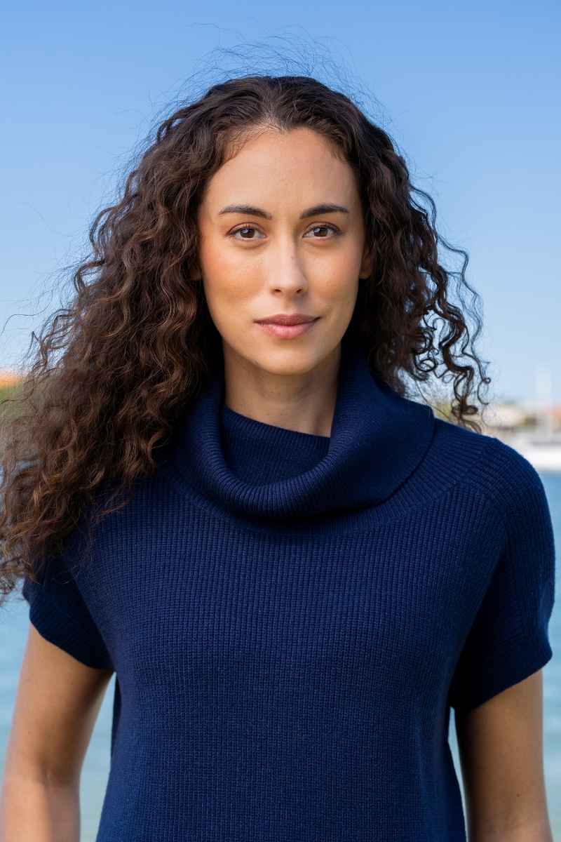 This deep navy viscose blend vest by Kaledio is simply lovely to touch. A well crafted piece for winter, with its roll neck and classic fit.