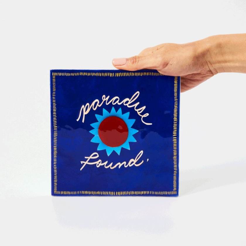 Like diving into a pool of colour. The Paradise Blue tile is bold and vibrant with a retro sun graphic and stylised text. Hand-painted on electric blue capiz, it's made for pairing with others, or just vibing on its own. Paradise Found. The End.