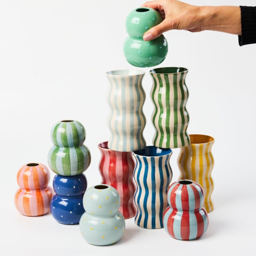 Bold yet feminine, the Palma Red Pink Stripe Vase is painted in a tomato red and pink rose stripe pairing that feels fashion-forward and full of joy. Its wavy silhouette adds drama to even the simplest of stems.