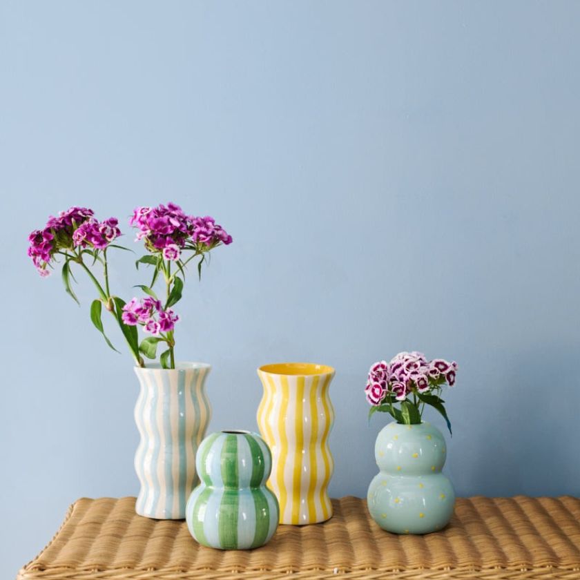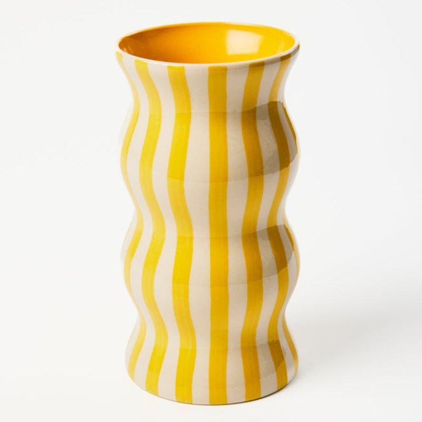 Sunny-side up. The Palma Yellow Stripe Vase radiates warmth with its rich golden yellow and white stripes, handpainted onto a rippled ceramic form. Ideal for bright blooms or a burst of colour on a neutral shelf.
