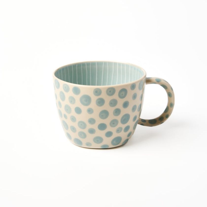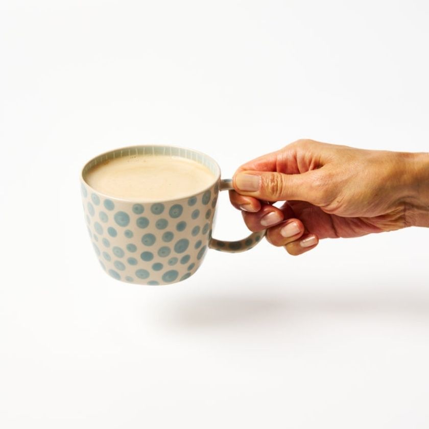 The Chino Mug Powder Dot pairs a soft blue base with hand-painted polka dots for a timeless yet modern feel. Crafted from fine earthenware, it's lightweight with a thin ceramic lip that coffee and tea lovers adore. The ergonomic handle makes sipping effortless, while its stackable design adds convenience. A bestselling ceramic mug for daily use, now in a fresh new palette.