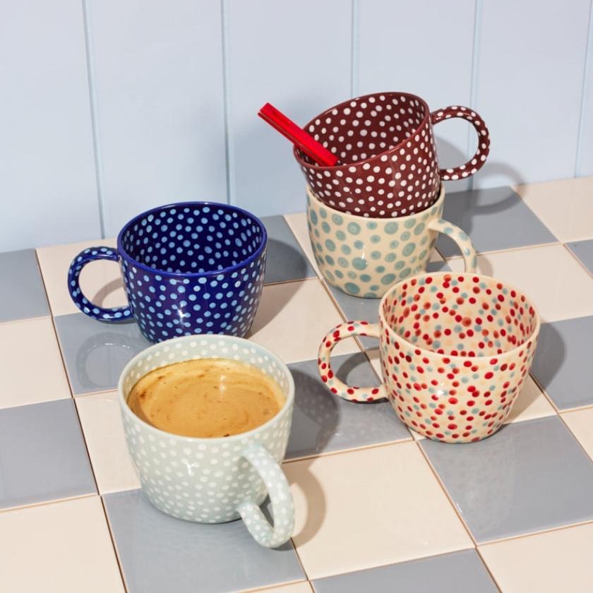 Ceramic mug with polka dot pattern on a white background