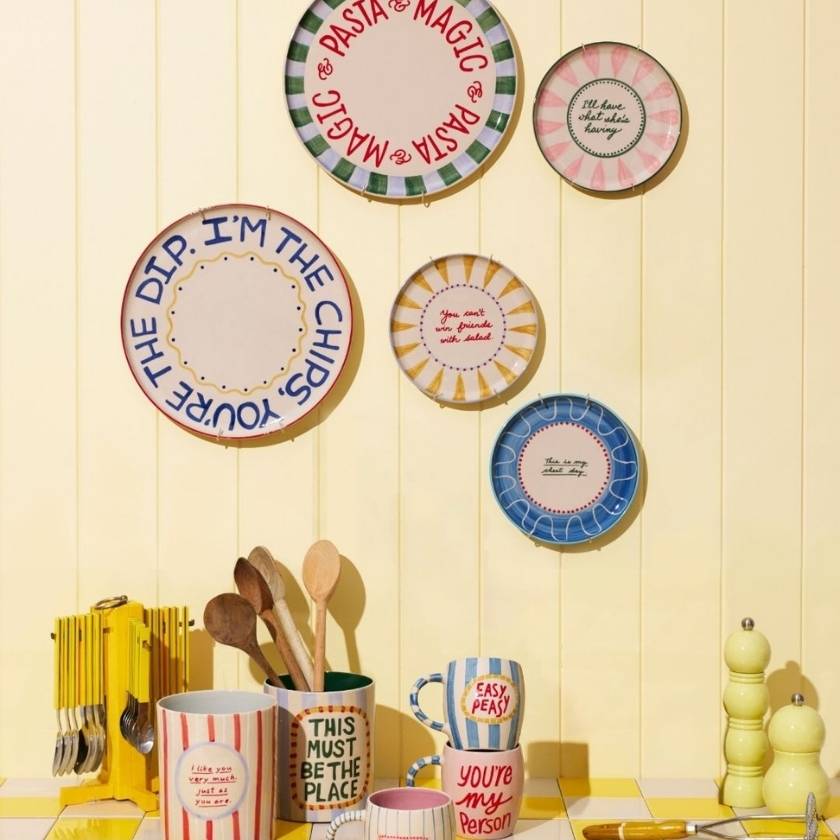Colorful plates with humorous sayings hanging on a wall above kitchen utensils.