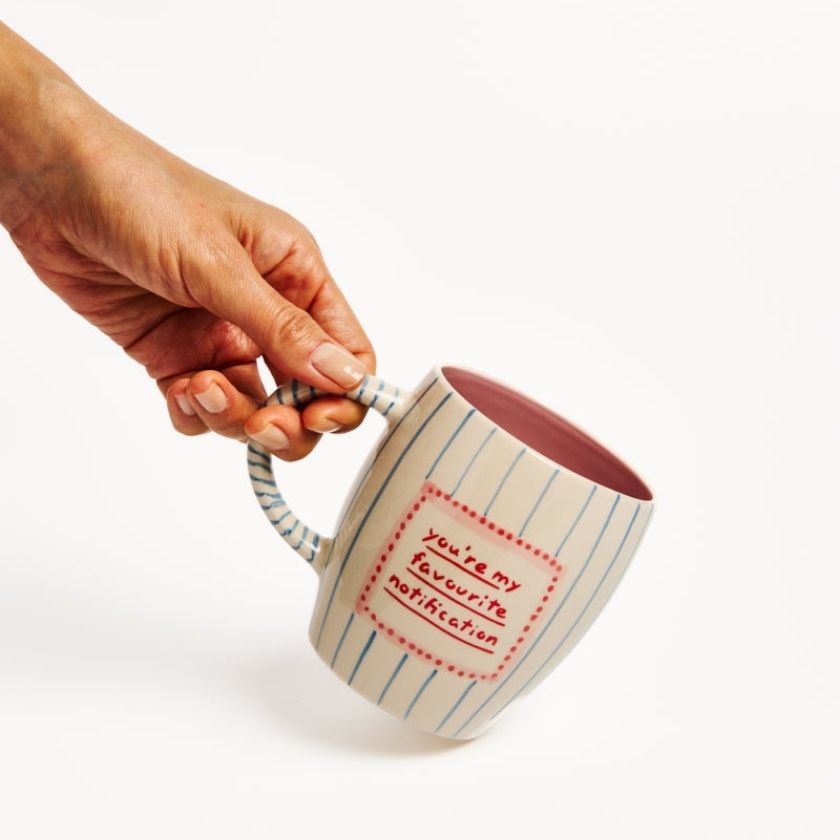 For the one who loves a cheeky message, the Love Notes Mug Notification is hand-painted with a witty text-style phrase "You're my favourite notification". Made from handmade earthenware, it's dishwasher safe, durable, and brimming with playful personality. A perfect coffee mug gift for whoever is your favourite notification IRL.