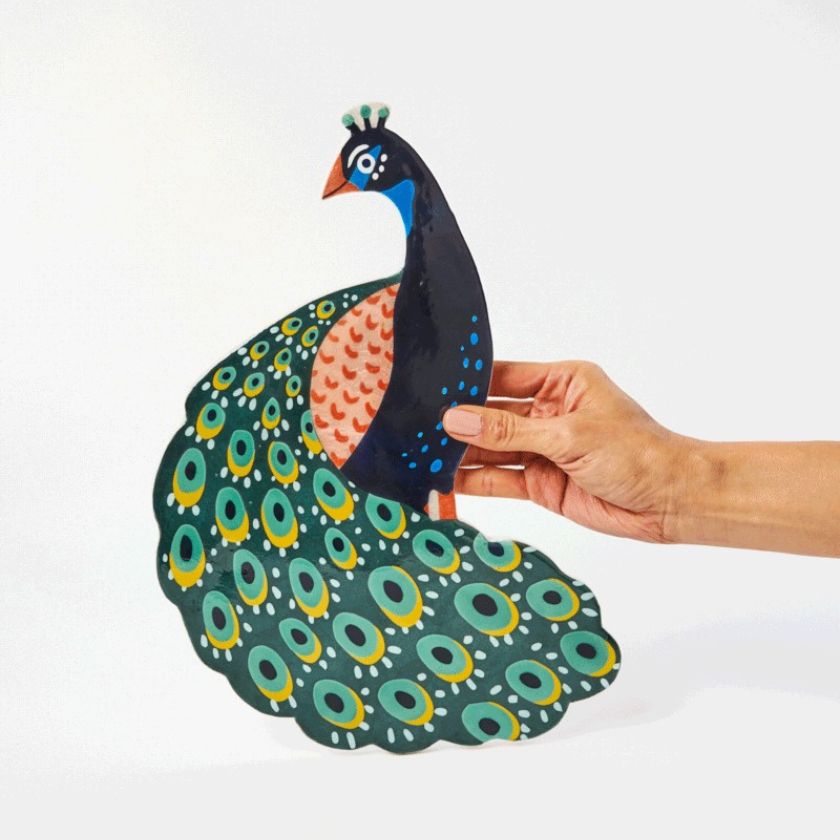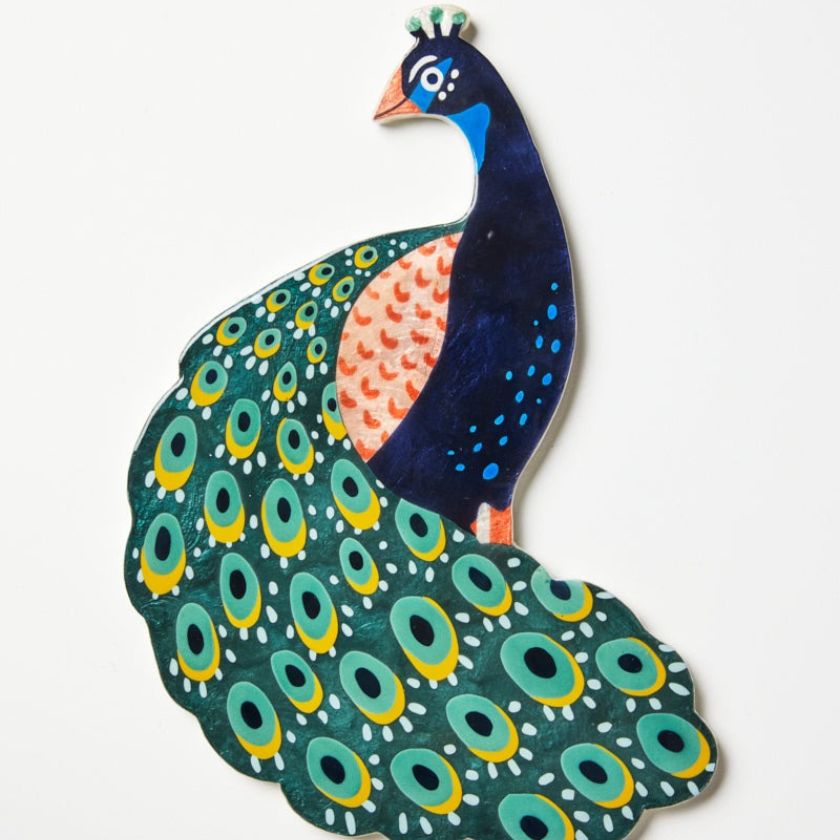 Proud as a peacock and twice as charming. This handmade peacock wall art is crafted from lustrous capiz shell, then painted by hand in rich jewel tones and bold patterning. It's tropical bird decor with a personality as colourful as its tail feathers. Team with other winged art in the Canopy range for ultimate tropical joy!