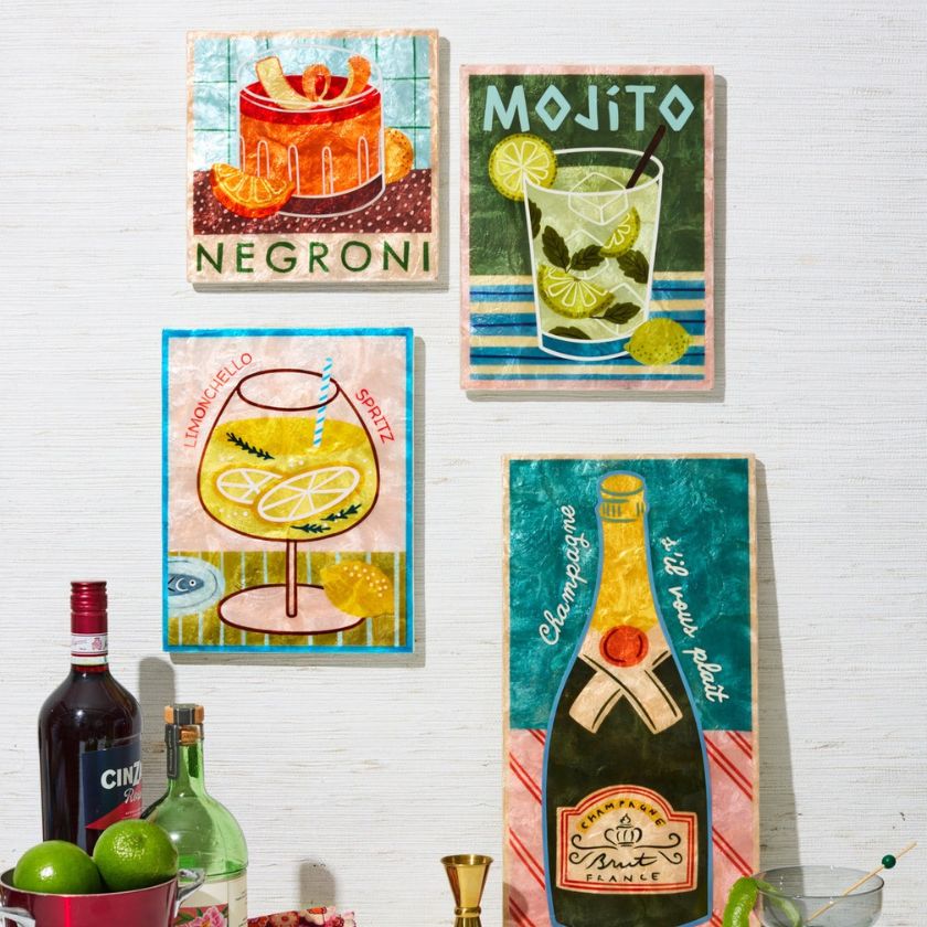 Bold and beautifully balanced, just like the drink itself. This Negroni wall art tile features a deep orange cocktail with a twist of citrus, all painted by hand on glossy capiz shell. It's the perfect piece for cocktail corners, kitchens and colour lovers alike.